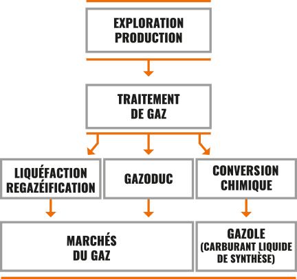 | Extraction, production et traitement, 3 étapes-clé : comme le pétrole, le gaz naturel peut être extrait en milieu terrestre ou marin. Avant d’être livré au consommateur, il subit plusieurs étapes de transformation. Il est d’abord extrait de la roche réservoir et transporté par canalisations jusqu’aux usines de traitement. Ensuite, un système d’épuration permet d’éliminer des sous-produits (azote, gaz carbonique, hélium...) qui réduisent son pouvoir calorifique, ainsi que des composés corrosifs (soufre) néfastes aux infrastructures de transport.